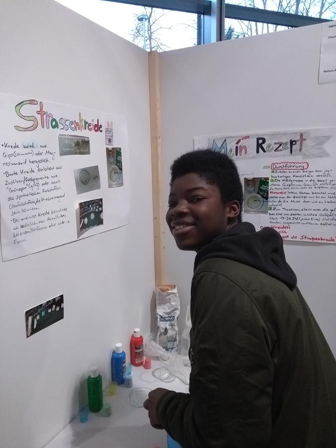 Über einen dritten Platz im Bereich Chemie und den damit verbundenen Geldpreis durfte sich Nelson Gam aus der Klasse 7a der Geschwister-Scholl-Realschule plus Andernach freuen. Sein Projekt „Straßenkreide-selbst gemacht“ überzeugte die Jury beim Regionalwettbewerb in Neuwied.