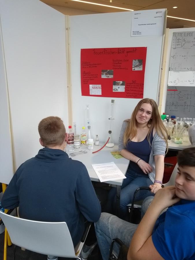 Die Schüler Marvin Engel, Klasse 9e, und Leander Herrmann, Klasse 9d, sowie die Schülerin Jasmin Stemmler, Klasse 10c, beschäftigten sich mit dem Thema „Feuerlöschen“ und erhielten eine Teilnahmeurkunde und ein interessantes Buch aus der Welt der Chemie.