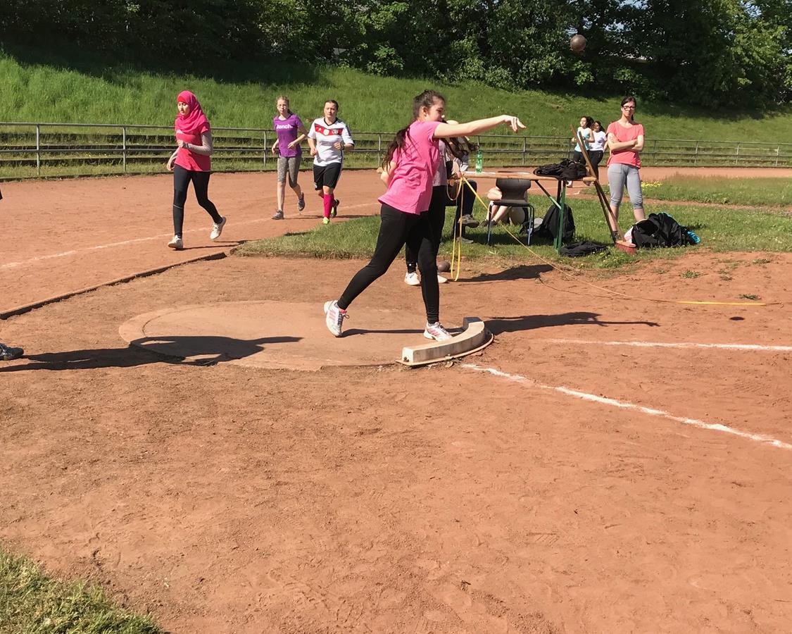 Zu Beginn der Veranstaltung absolvierten sie ihren 800m-Lauf. Unglücklicherweise gab es ein technisches Problem bei der Zeitmessung, sodass den Mädchen keine Werte beim Zieleinlauf zugeordnet werden konnte. Da bei den Bundesjugendspielen immer nur die drei besten Disziplinen gewertet werden, wäre auch ohne den 800m-Lauf für die Mädels nach Weitsprung, Ballwurf und Sprint der Wettkampf komplett gewesen. Trotz dieses Umstandes und der mittlerweile um die Mittagszeit sehr hohen Temperaturen entschloss sich die komplette Riege, die Mittelstrecke nochmals zu laufen.