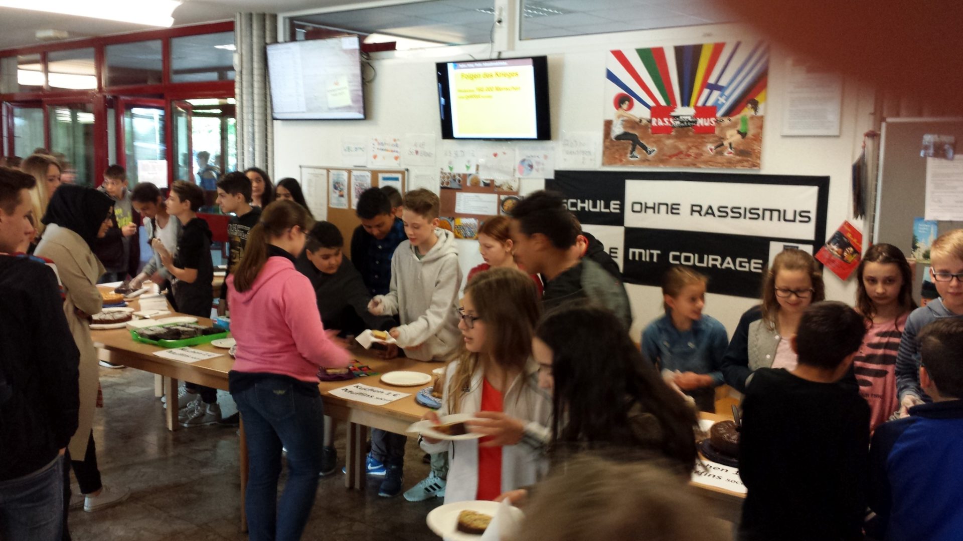 Mit den vielen Kuchen, die die Eltern der Schülerinnen und Schüler der kath. Religionsgruppe Klasse 5a/5b und der Ethikgruppe 7a/7b gebacken hatten, war der Abschluss der Unterrichtsreihe „Flucht“ ein großer Erfolg.
