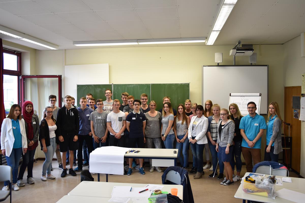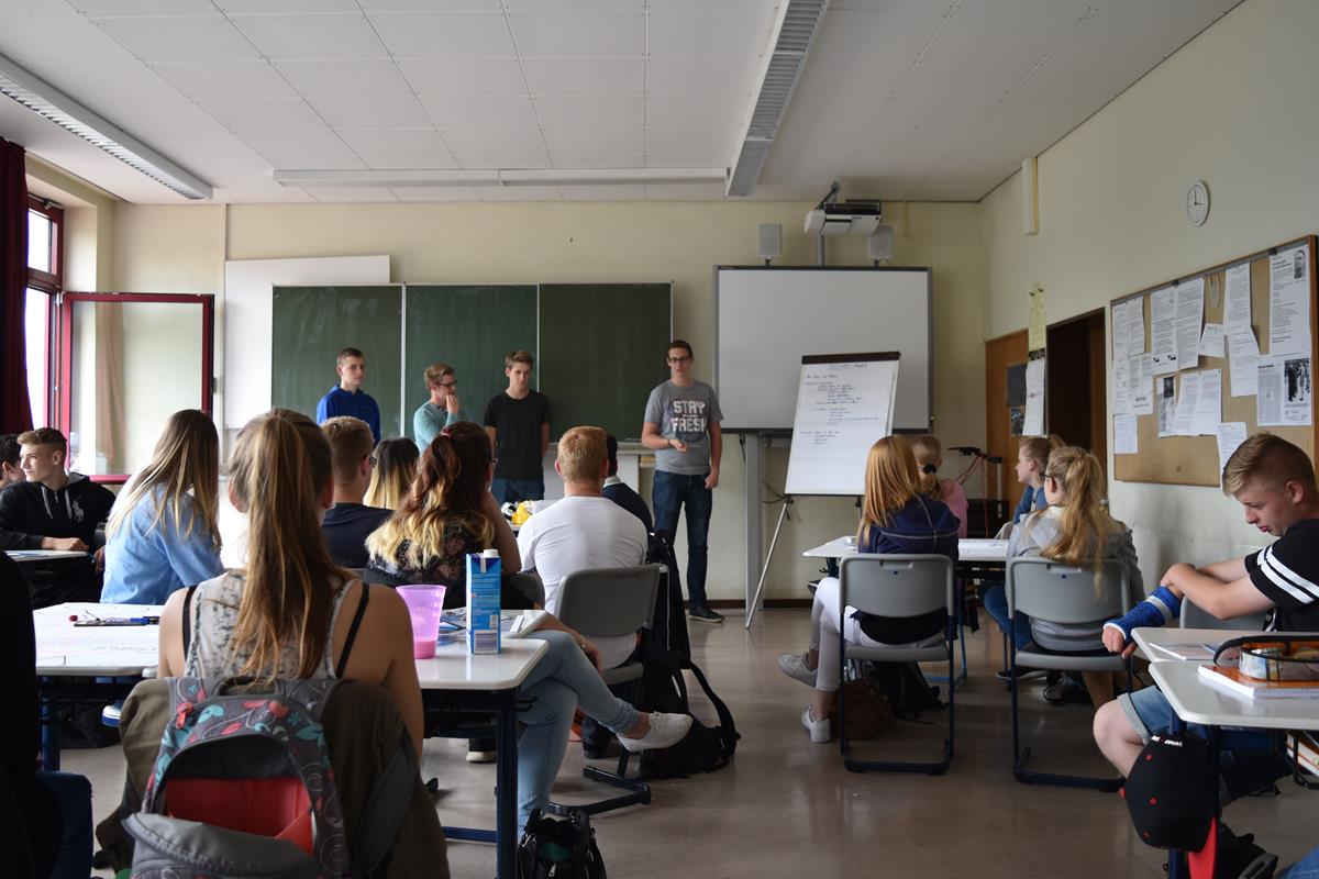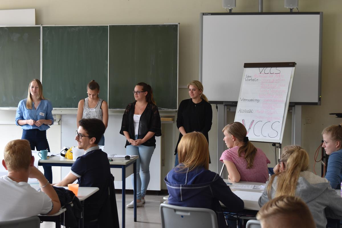 Am 21. Juni und am 27. Juni erhielten die beiden Wirtschaftskurse von Frau Henrichs Besuch von der SHD aus Andernach. Die Ausbildungsleiterin Peggy Kücken und einige von ihren Auszubildenden führten ein Projekt zum Thema „Unternehmensgründung“ durch. Zuerst stellte Frau Kücken mit ihrem Team die SHD vor. Anschließend ging es auch schon in die Projektarbeit. Jede Schülergruppe sollte eigenständig ein Unternehmen planen und ihre Geschäftsidee bezüglich Standortwahl, Konkurrenz, Markteinschätzung und Zukunftsaussichten unter die Lupe nehmen. Schon schnell rauchten die Köpfe. Die Ergebnisse konnten nicht unterschiedlicher sein… Von Ketchup-Leder für den Burger, Die Bowl (Die Antwort auf die Playstation), Jonas Frische Fische, Döner in der Dose, American-Shop, Veganes – Eis, BMW- Tuning bis hin zur SUNPOWER und dem Glätteisen für die Handtasche wurden einige kreative Geschäftsideen präsentiert. Das Feedback der Schüler fiel sehr positiv aus. Gerade die Übernahme von Verantwortung für ein Unternehmen hat ihnen große Freude bereitet. Im Vordergrund standen die gemeinsame Planung und die kreative Umsetzung der ersten Ideen. Durch Rückfragen der Auszubildenden der SHD mussten die Schüler für ihre Planungen Rede und Antwort stehen. Dies ermöglichte eine hohe Identifikation mit den eigenen Ideen.