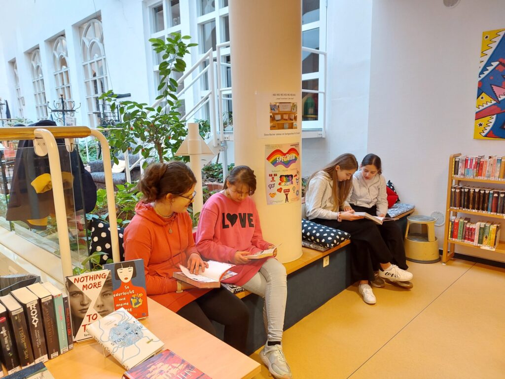 Die Klasse wurde vom Fachpersonal in zwei Gruppen über die unterschiedlichen Medien und Ausleihmöglichkeiten aufgeklärt. Die Bibliothek bietet ein modernes und breit gefächertes Medienangebot mit mehr als 35.000 Büchern, CDs, CD-ROMs, DVDs, Zeitschriften und Zeitungen. Die Schülerinnen und Schüler durchsuchten anschließend alle drei Etagen und lasen gemeinschaftlich in den gemütlichen Leseecken.